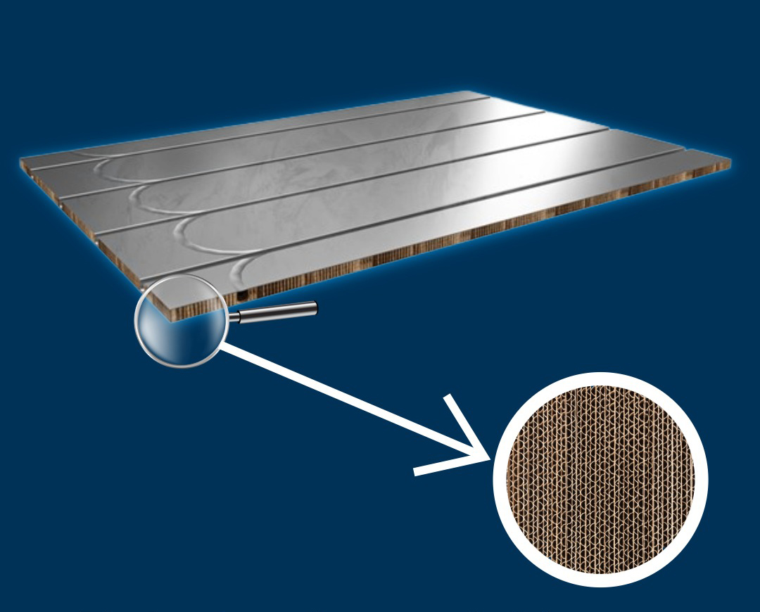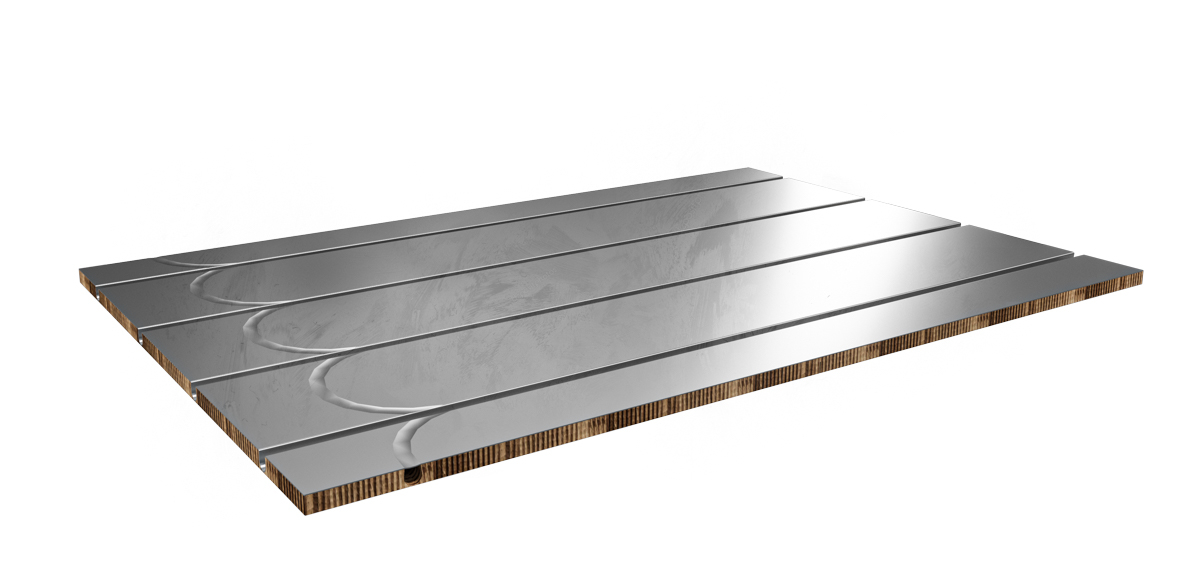 Platen er pappbasert og har et laminert varmefordelingslag for effektiv varmefordeling. Den leveres med ferdige rørspor for 16 mm rør, c/c 200 mm, og integrerte vendespor.