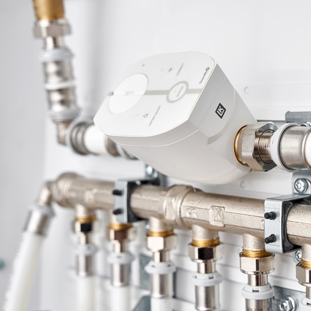 CubicSecure måler bare 110 mm, og er verdens minste vannstopperenhet. Den har en kraftig og intelligent teknologi med ventil, motor og trykk-, temperatur- og ultralydsensorer.