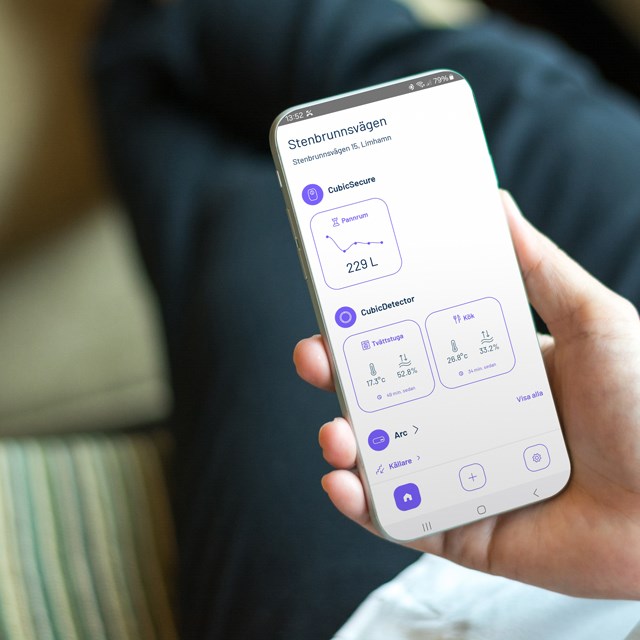 Med én eller flere CubicDetectorer installert og koblet til CubicSecure får du utvidet beskyttelse mot lekkasjer. Detektorene oppdager direkte kontakt med vann og måler kontinuerlig temperatur og fuktighet. Enhetene plasseres der risikoen for skjulte lekkasjer er høy, for eksempel i et kjøkkenskap under vasken.